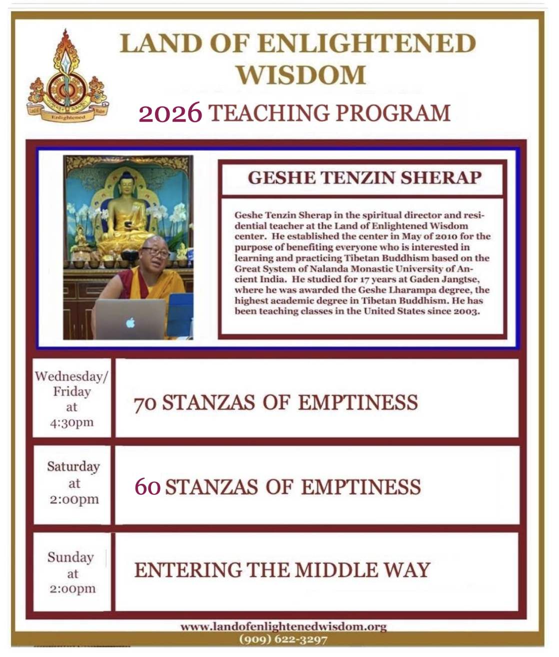 Geshe Tenzin Sherap began teaching the Sunday class, "Candrakirti's Entering The Middle Way" on August 22, 2021. Candrakirt's 7th century classic was written as a supplement to Nagarjuna's Root of the Middle Way. This text integrates the central insight of Nagarjuna's thought - the rejection of any metaphysical notion of intrinsic existence- with the well-known Mahayana framework of the ten levels of the bodhisattva.