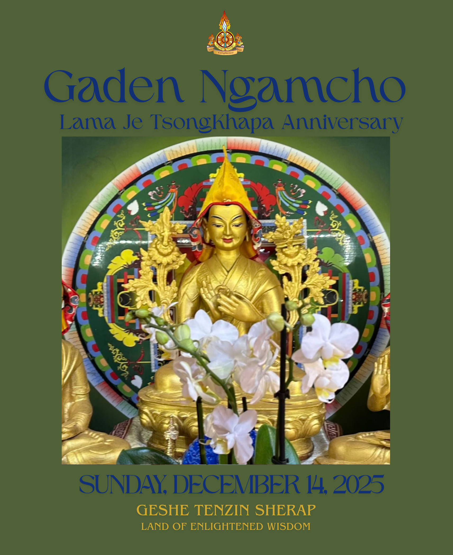 Wishing you and your family a very auspicious Gaden Ngamcho on Sunday, December 14, 2025. Geshe Sherap will teach the Sunday, Entering the Middle Way class on December 14, 2025 at 2:00pm on Gaden Ngamcho. Gaden Ngamcho celebrates the accomplishments of the saint and scholar Lama Je Tsongkapha and the numerous texts written in his lifetime. He is founder of the Gelugpa tradition of Tibetan Buddhism, built on the foundations of the Kadampa tradition, the legacy of Atisha. Lama Je Tsongkhapa (1357-1419) was born in Amdo, in northeast Tibet. Interested in the miraculous events that occurred at Tsongkhapa’s birth, the master Choje Dondrup Rinchen took charge of his education when he was seven, giving him many teachings and tantric empowerments. Lama Je Tsongkhapa left Amdo at sixteen to further his studies, studying under fifty teachers and gaining a wide knowledge of both sutra and tantra, being especially impressed with Dignaga and Dharmakirti’s system of reasoning. There followed an intense period of study and meditation, during which he experienced visions of Manjushri. |